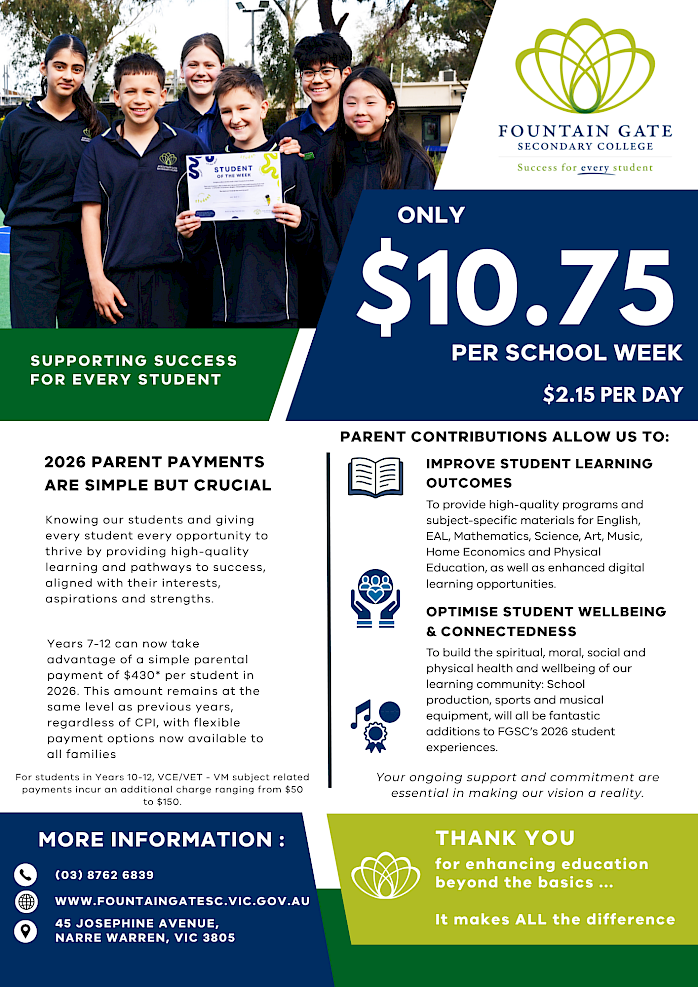 Our school is proud of the high quality of facilities, resources, and programs we provide to support students’ learning, wellbeing, and interests. However, delivering and maintaining these opportunities involves costs beyond the level of government funding received.